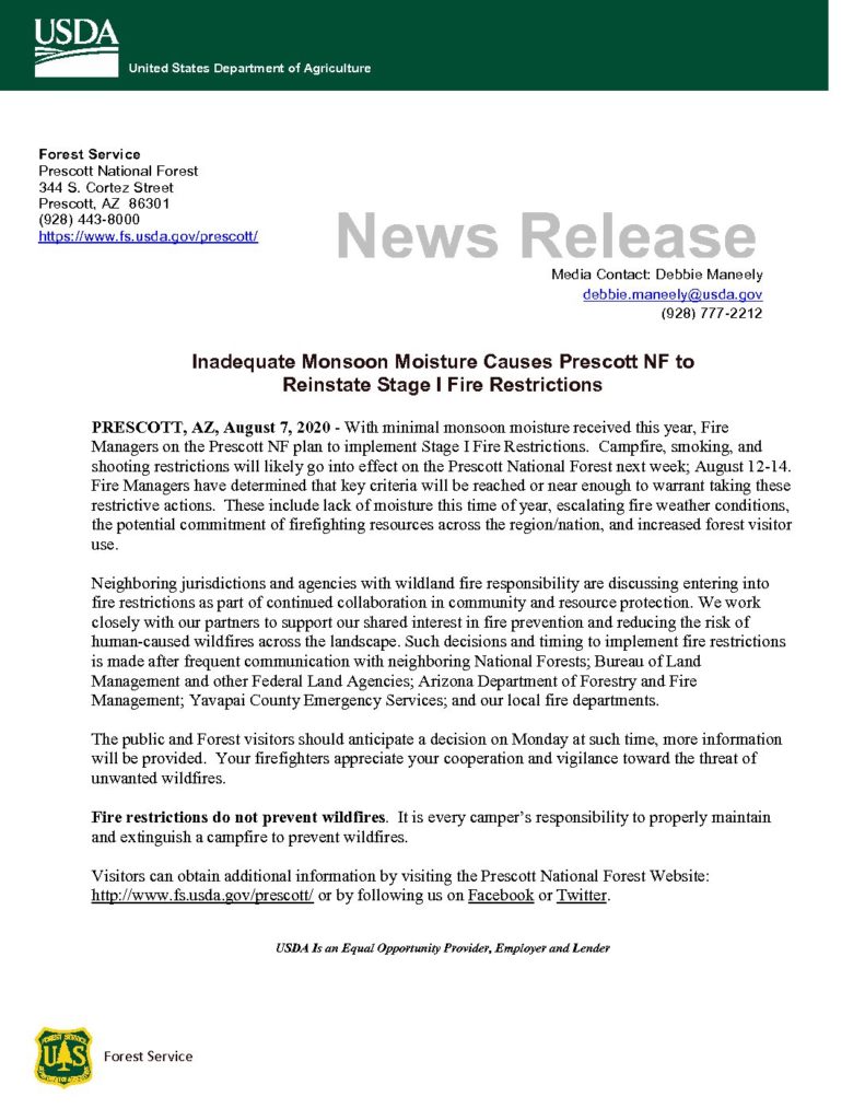 The Groom Creek Fire District, will also be implementing similar restrictions on residential outdoor warming fires, smoking, and shooting. This is planned is to go into effect Friday, August 14th @ 0800.